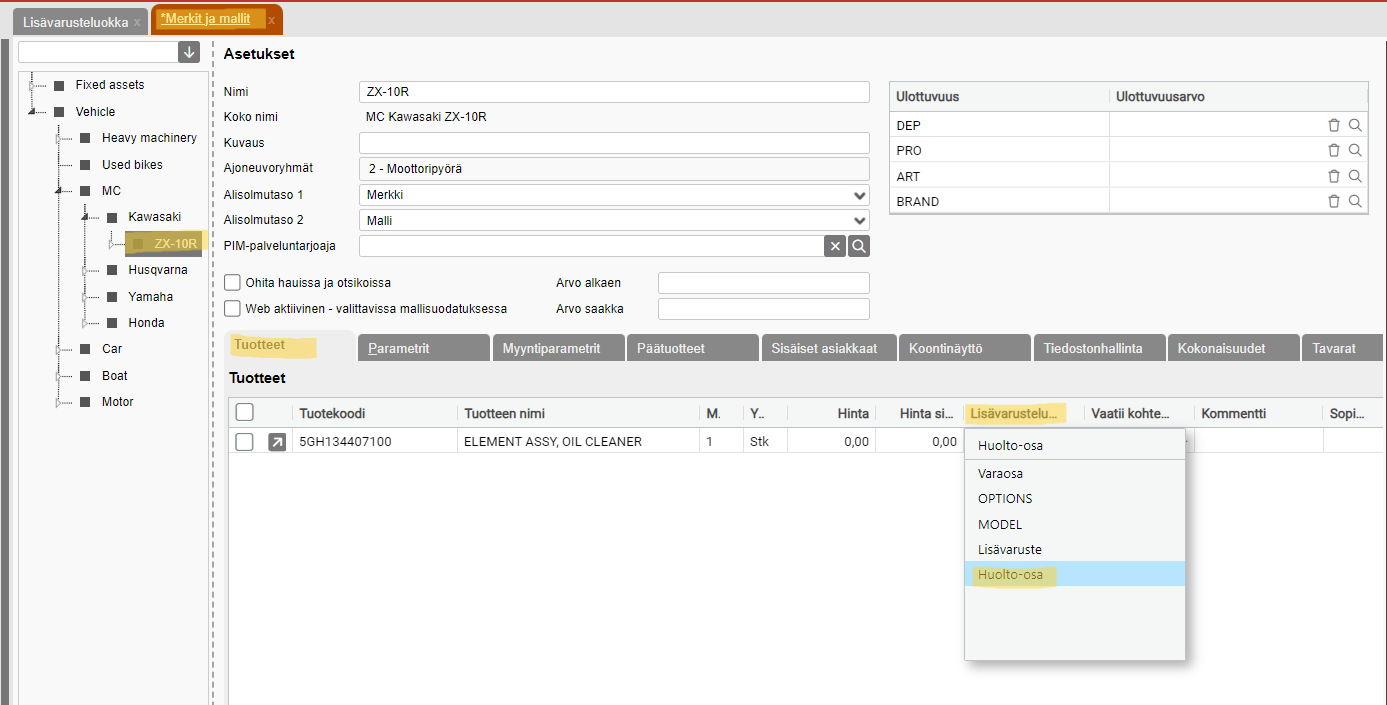 Mene päävalikon kautta merkki- ja mallirekisteriin. Valitse vasemmalla olevasta merkki- ja mallipuusta se taso, johon haluat liittää tuotteita. "Tuotteet"-välilehdellä voit lisätä tälle tasolle sopivia tuotteita. Lisätessäsi tuotteita, sille pitää valita äsken luotu luokka. Jos tuote sopii vain yhteen malliin, lisää tuote vain sen omalle tasolle. Jos taas kyseessä on yleisempi tuote, esim. huoltopukki, pyöräpeite tai jarrulevyyn kiinnitettävä varashälytin, voidaan se laittaa koskemaan kaikkia merkin malleja tai kaikkia moottoripyöriä. Esim. jos lisäät tuotteen Kawasaki-tasolle, se on yhteensopiva kaikkien Kawasakin mallien kanssa.