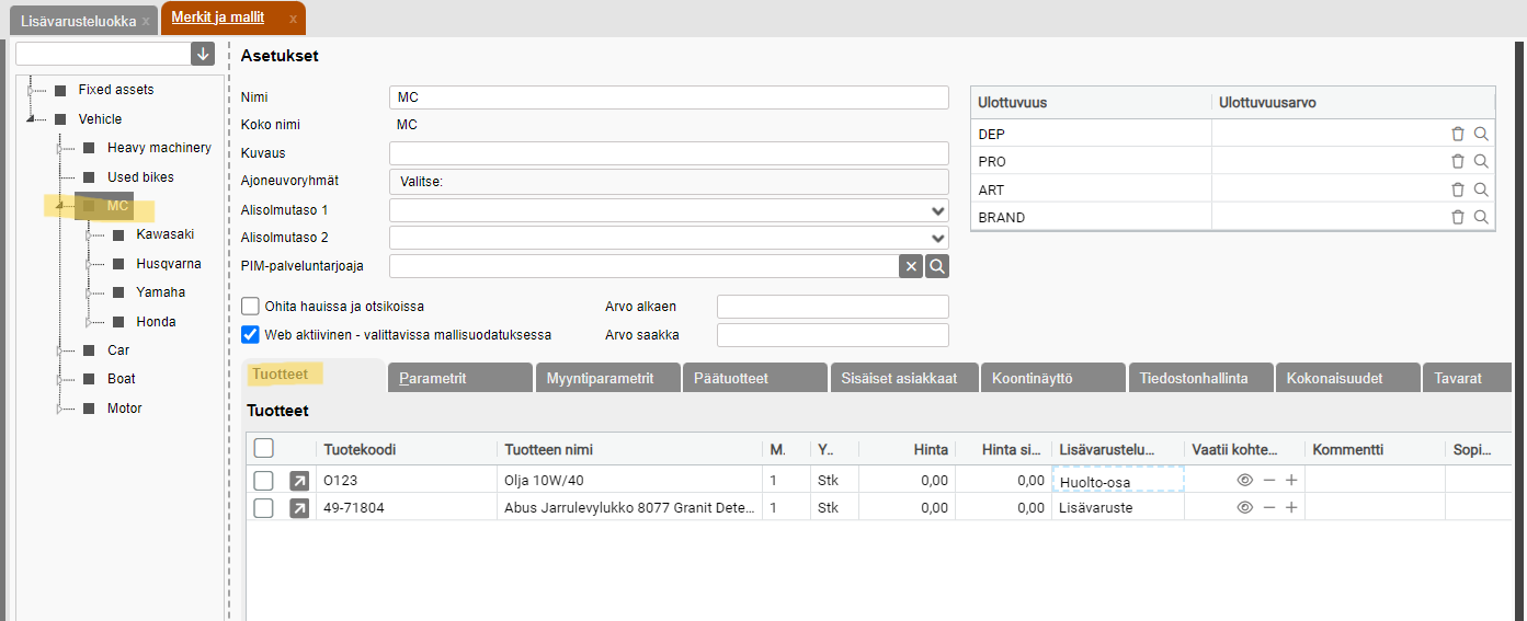 Tuotteet voidaan liittää merkkeihin ja malleihin yhteensopivina tuotteina. Tämä helpottaa oikeiden tuotteiden löytämistä. Lisäksi, jos sinulla on verkkokauppa käytössä, asiakkaat voivat hakea mallin mukaan sopivia tuotteita.