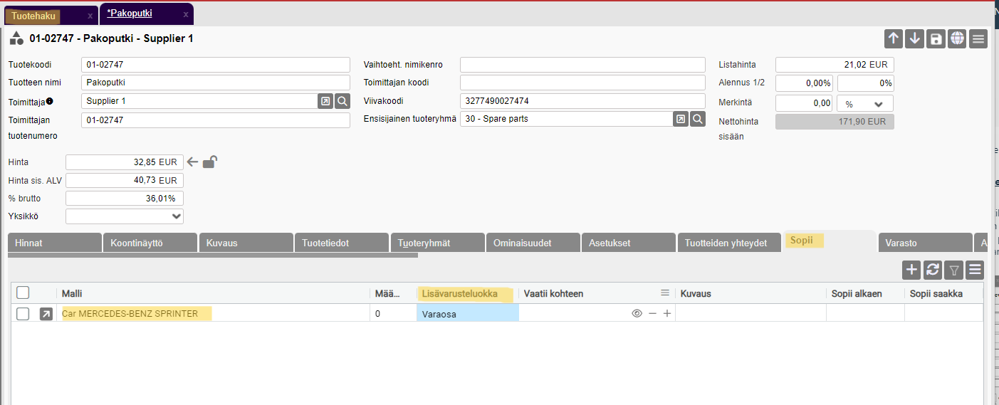 Valitse tuotteiden haun kautta tuote, jonka haluat linkittää merkkiin tai malliin. Mene välilehdelle "Sopii". Tässä voit valita haluamasi mallin. Tässä on sama logiikka kuin ylemmässäkin, eli jos valitset tähän vain Mercedes-Benz, ohjelma tulkitsee sen sopivan kaikkiin kyseisen merkin malleihin. Yhden mallin valitsemalla se tulkitaan sopivaksi vain siihen malliin. Muista valita lisävarusteluokka.