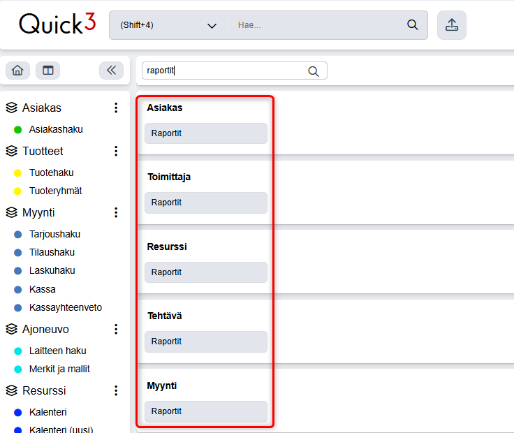 Quick3:sta löytyy raportteja sekä Raportit-osiosta sekä Analytiikasta. Nämä löytyy jokaisesta kategoriasta. Pääset näihin hakemalla päävalikosta: