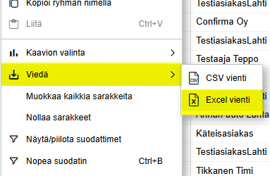 Kuten muissakin näkymissä, myös Analytiikan näkymissä tiedot saadaan vietyä Exceliin hiiren oikeaa klikkaamalla.