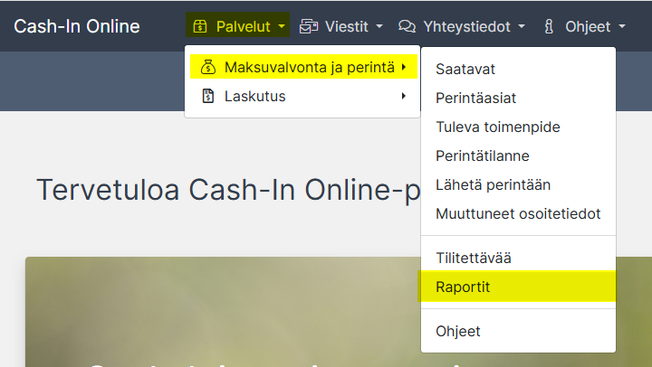 Kirjaudutaan Cash-in Online -palveluun osoitteessa https://online.cash-in.fi/ ja valitaan Palvelut - Maksuvalvonta ja perintä - Raportit
