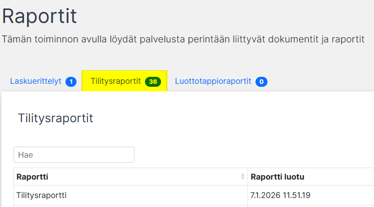 Tämän jälkeen valitaan välilehti Tilitysraportit. Kirjanpitoon toimitetaan kaikki kirjanpitokuukauden raportit.