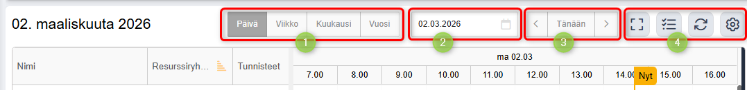 Vasemmalla olevan resurssinäkymän avulla voit helposti muokata, mitkä resurssit näkyvät aikajanalla. - Ajanvarausten tyylin muokkaaminen
