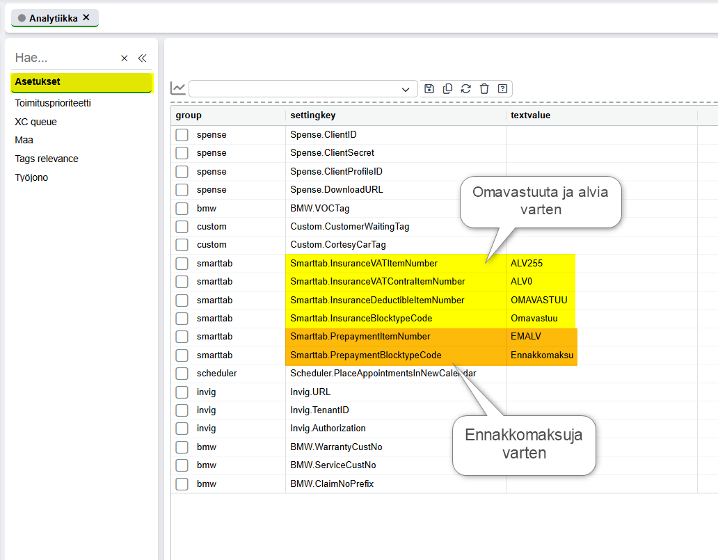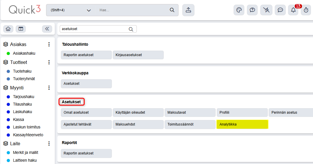 Jotta voidaan hyödyntää yllä mainittuja toimintoja, on sitä varten määritettävä tuotteet ja lohkotyypit. Tämä tapahtuu Analytiikka-osiossa, joka löytyy päävalikosta Asetusten alta.