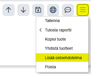Manuaalinen ostoehdotelma voidaan tehdä joko myyntitilaukselta, tuotehausta tai tuotekortilta. Myyntitilauksella tai tuotehaussa klikkaa hiiren oikealla tuotteen päällä ja valitse Lisää ostoehdotelma. Tuotekortilla kyseinen toiminto löytyy oikean ylänurkan valikon kautta.