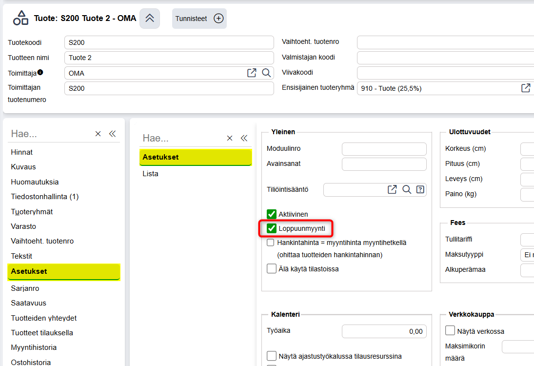 Mikäli tuote on merkattu loppuunmyyntituotteeksi, se ei tule ostoehdotelmalle. Tämä tehdään tuotekortin Asetukset-välilehdellä.