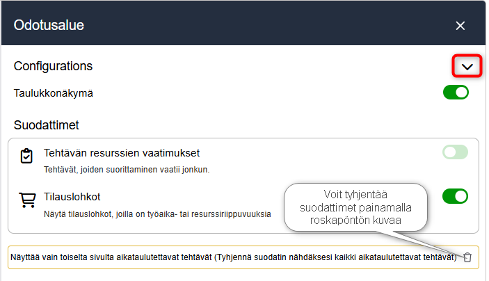 Saat Odotusalueen asetukset auki painamalla pientä nuolta Odotusalueen oikeassa reunassa. Voit vaihtaa taulukko- ja lohkonäkymän välillä painamalla "Taulukkonäkymä"-kytkintä. Täältä löydät myös suodatusvaihtoehdot, joiden avulla voit valita, mitkä odottavat työt näytetään. Jos suodatin on päällä, näet siitä ilmoituksen suodattimien alapuolella.