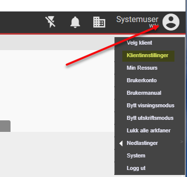 Klientinnstillinger inneholder en del generelle innstillinger og er tilgjengelig fra meny oppe til høyre i bildet.