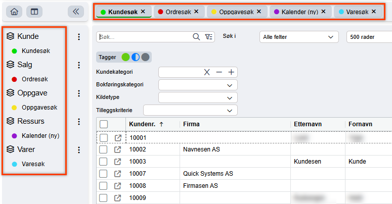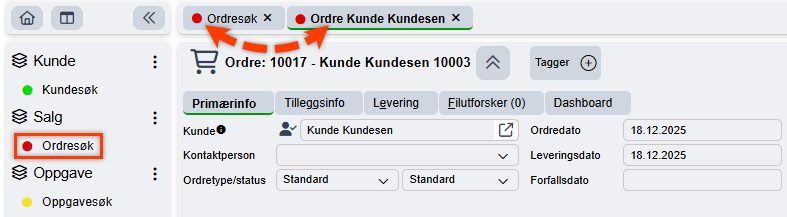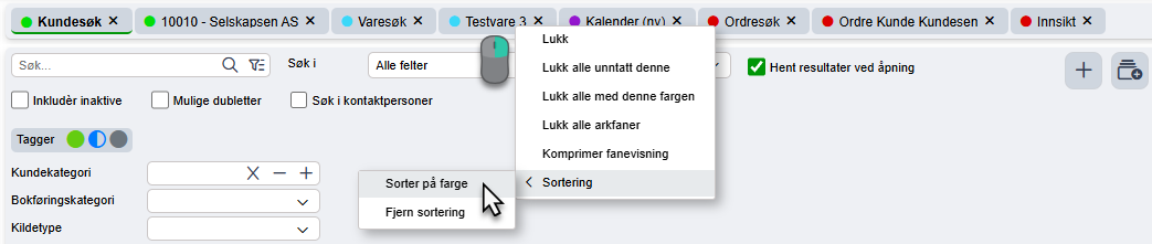 Alle nye faner som åpnes via de fanene som allerede ligger i hurtigmenykategoriene vil ha tilsvarende fargelegging. F.eks. om man har Ordresøk i hurtigmenyen vil alle ordre som åpnes via søkefanen få samme farge i sine respektive faner.
