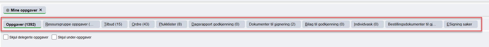 I tillegg til å vise oppgaver, får man også oversikt over blant annet tilbud, ordre, plukklister hvor man står som selger, og man kan finne oversikt over e-signeringssaker som man har sendt til kunde.