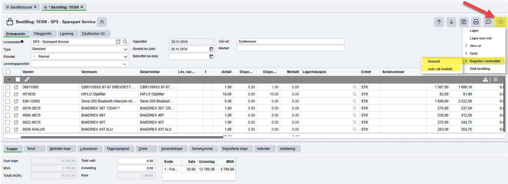 - Auto (alt mottatt): kolonnen for mottatt antall settes lik bestilt antall. Kan være en fordel hvis du antar at alle varer på bestillingen er mottatt. Anbefaler at bestillingen sjekkes likevel for å være sikker på at antallet stemmer.