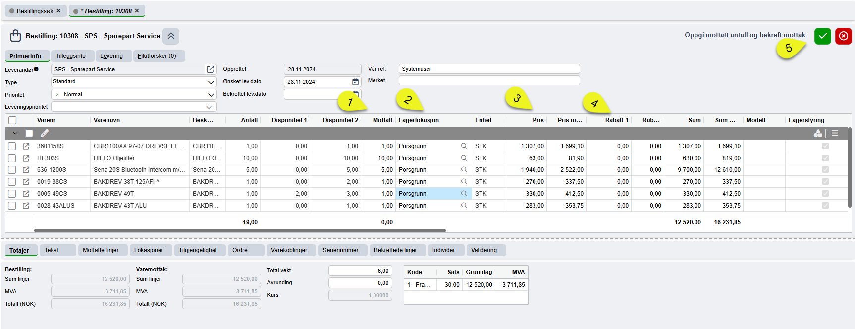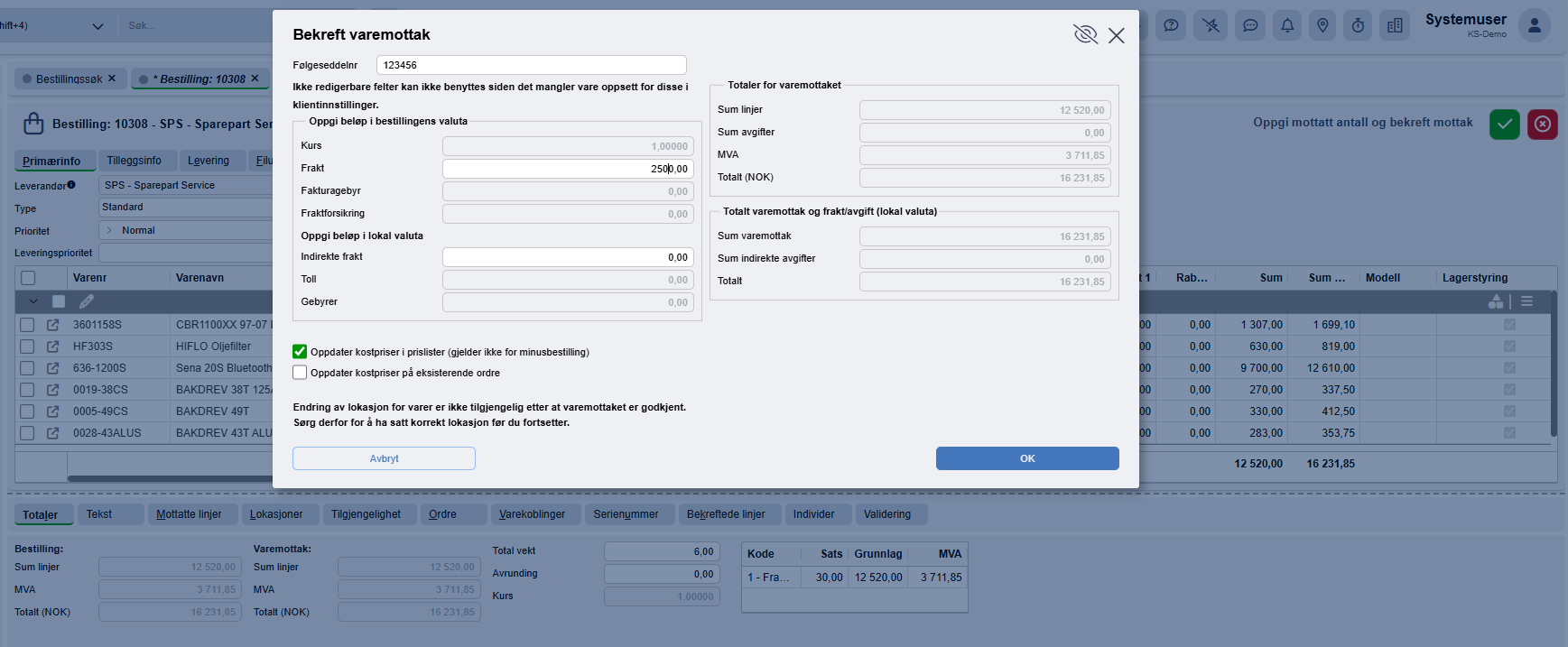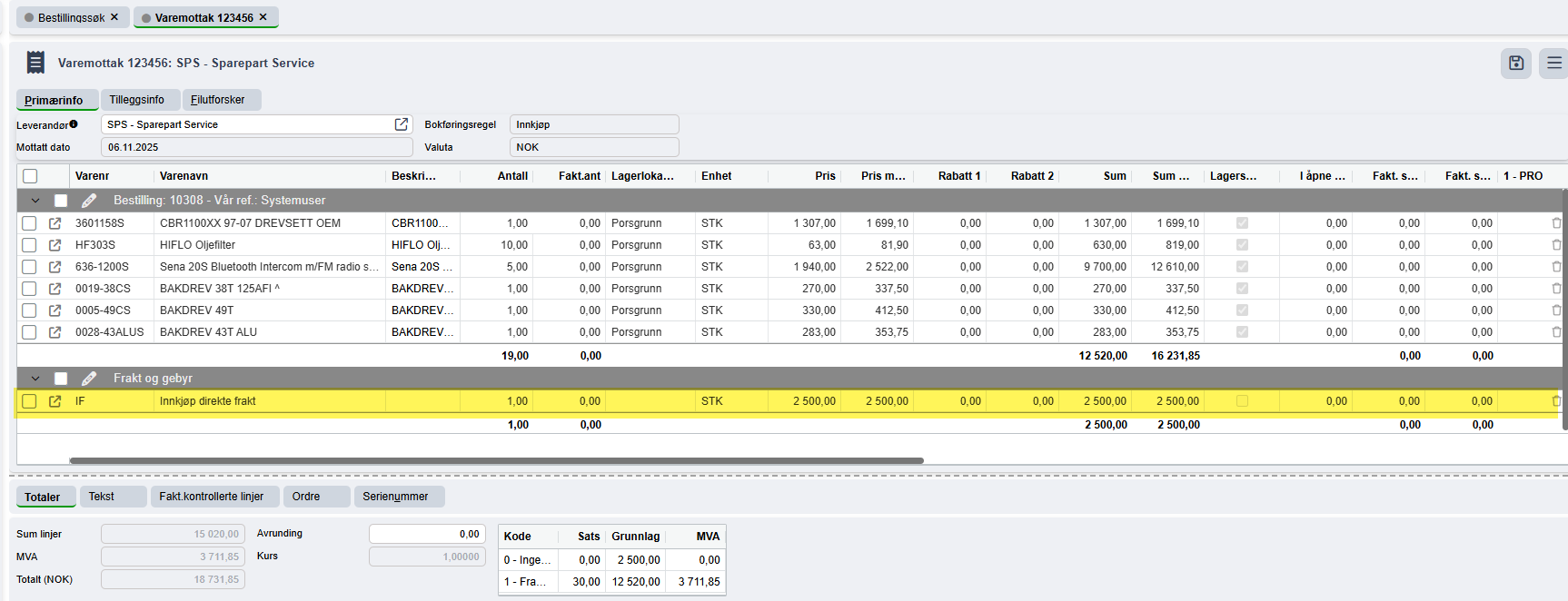 Du har nå fått en oppdatert totalsum på Varemottaket.