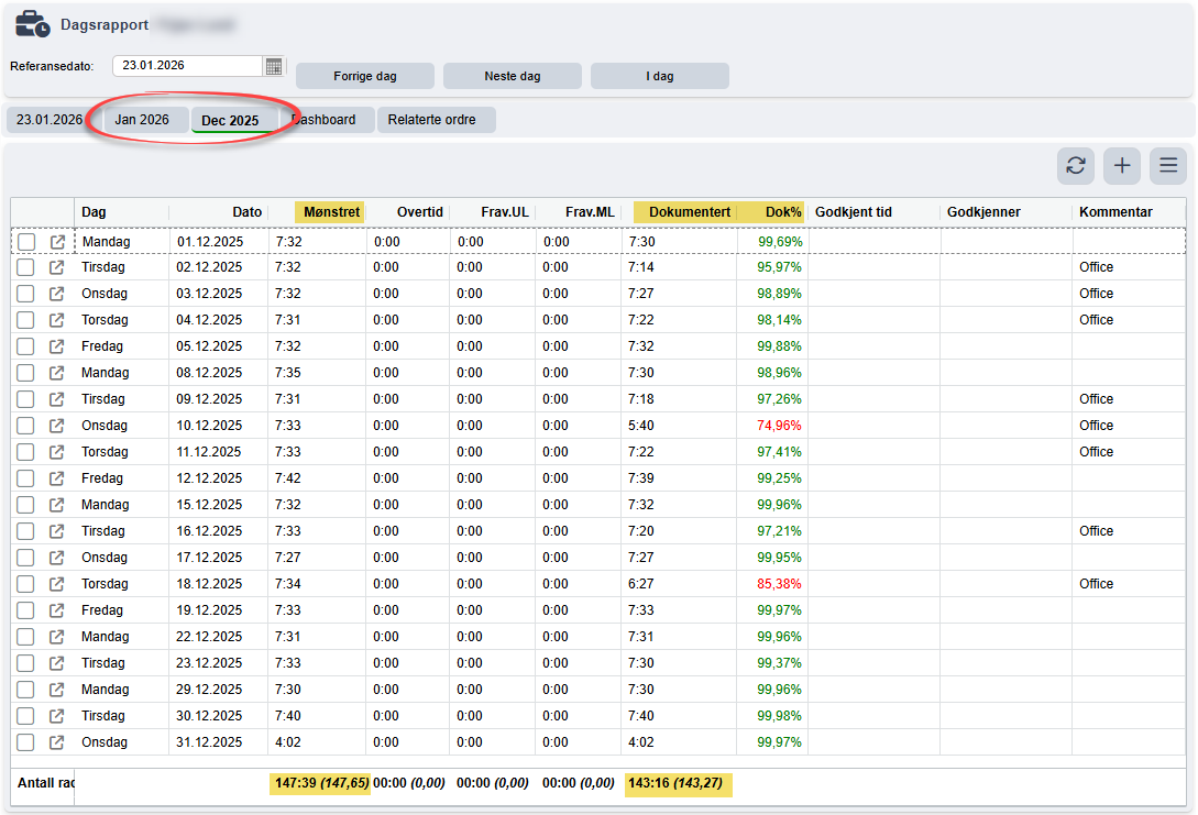 Kolonnen kalt "Dok%" viser hvor mye av den innstemplede tiden man benytter på spesifikke oppgaver i løpet av en dag.