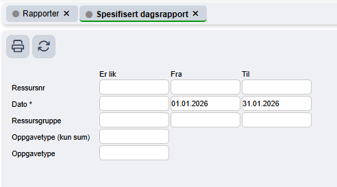 For å se spesifikke perioder kan man kjøre en egen rapport for dette. Åpne hovedmenyen (⌨️Alt+H), og gå til Ressurs > Rapporter > "Spesifisert dagsrapport". Merk at denne rapporten kun er tilgjengelig om din ressurs har tilgang til ressurshåndtering. Se vår artikkel om Tilgangsstyring for mer informasjon om dette.