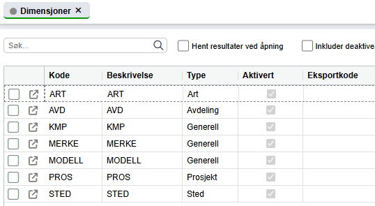 De mest vanlige dimensjonene er avdeling, prosjekt, art, merke og modell.