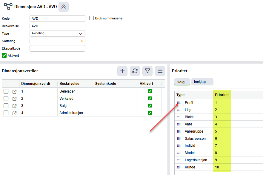 Rekkefølgen angis inne på den enkelte dimensjonen. Trekke Typen opp eller ned ved hjelp av 'rekkefølgevelger' (rød pil).