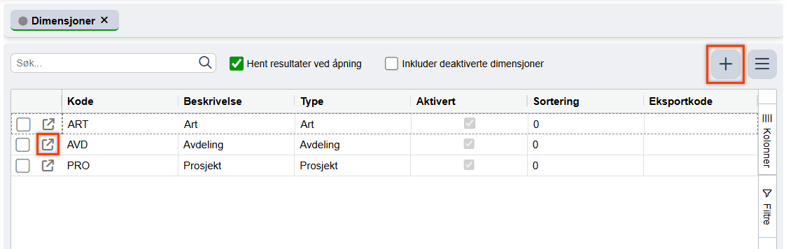Du finner oppsettet av dimensjoner ved å åpne hovedmenyen (⌨️Alt+H), og deretter Regnskap > Dimensjoner. Etter et blankt søk vil du få en tabell som ser omtrent slik ut: