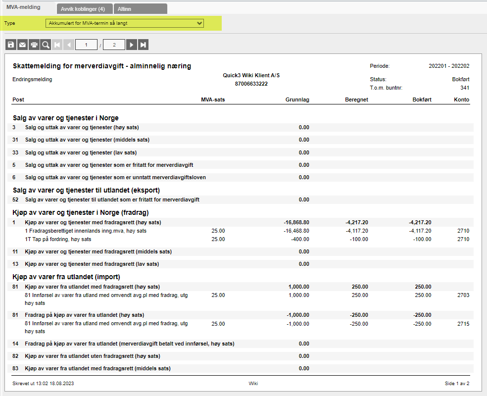NB: Denne rapporten må avstemmes mot regnskap. Blir det oppdaget feil eller merkelig beløp for enkelte poster må dette sjekkes ut og korrigeres før MVA-oppgjøret bekreftes.