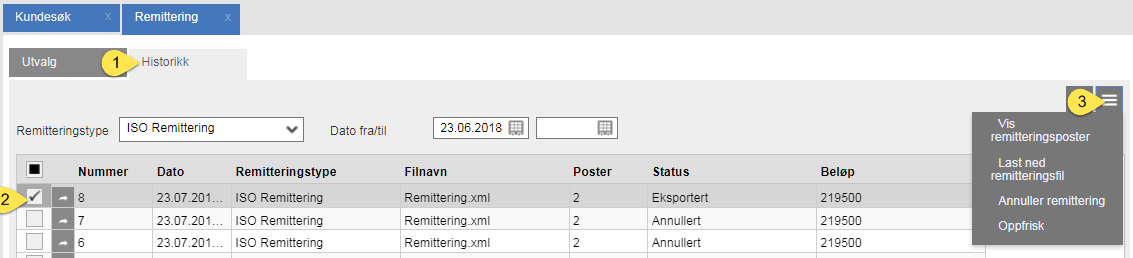 Du kan velge å annullere en remittering. Postene flyttes da tilbake til remitteringsoversikten, og remitterings status i reskontro tilbakestilles. I historikken merkes loggen med Annullert. Dette kan være aktuelt hvis du har remittert feil poster, evt for mange poster, og har behov for å kjøre en ny korrekt remittering. I oversikten nedenfor er det kjørt tre annulleringer. Når du klikker deg tilbake til fanen Utvalg, må du klikke oppfrisk for å laste inn igjen postene.