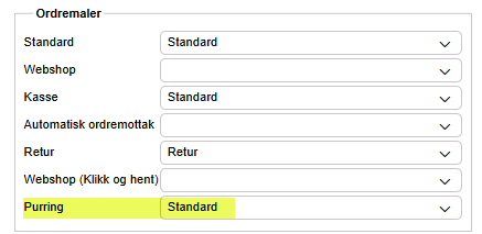 Det må ligge ordremal inne for purringer. Denne kan være lik som for vanlig ordre, eller det kan opprettes egen ordremal for purring. Legges inn under Klientinnstillinger - Salg - Ordremaler.