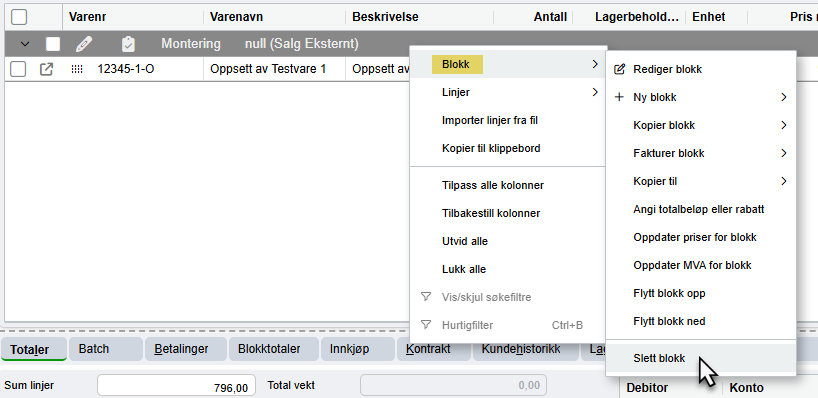For flere valg angående blokker, høyreklikk i ordrevinduet på en eksisterende blokk. Her vil du bl.a. kunne legge til nye blokker, slette blokken, flytte den opp eller ned i ordren, kopiere blokken til en bestilling, eller legge til rabatter.