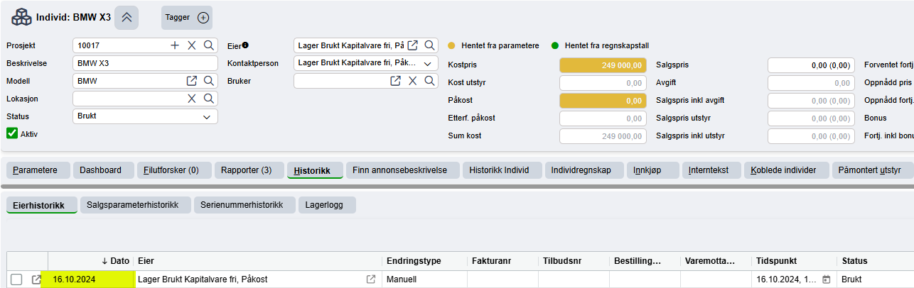 - Hvis den inng.fakturaen ikke er bokført før salg av individ faktureres hentes kostprisen for individet fra Parameteret Kostpris på individet. Hvis denne er lagt inn feil vil det føre til at feil kostpris belastet lagerkonto ved salg.