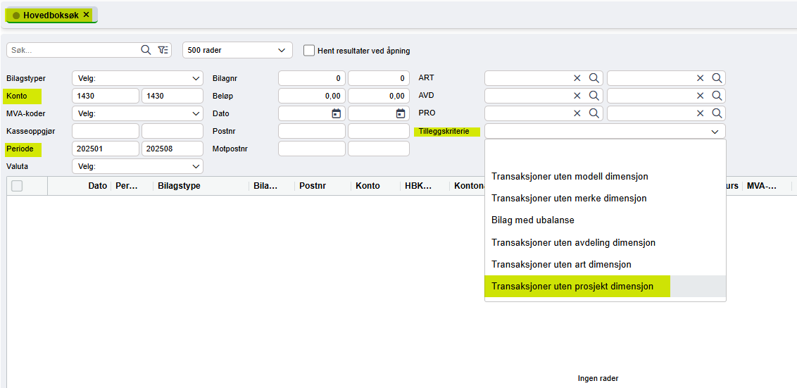 Bilag som er bokført til lagerkonto for individer uten prosjektnr vil ikke komme med på rapporten ‘Prosjektdetaljer’. Disse må derfor avdekkes fra Hovedboksøk. Her kan man søke opp posteringer uten prosjektnummer på en valgt konto.