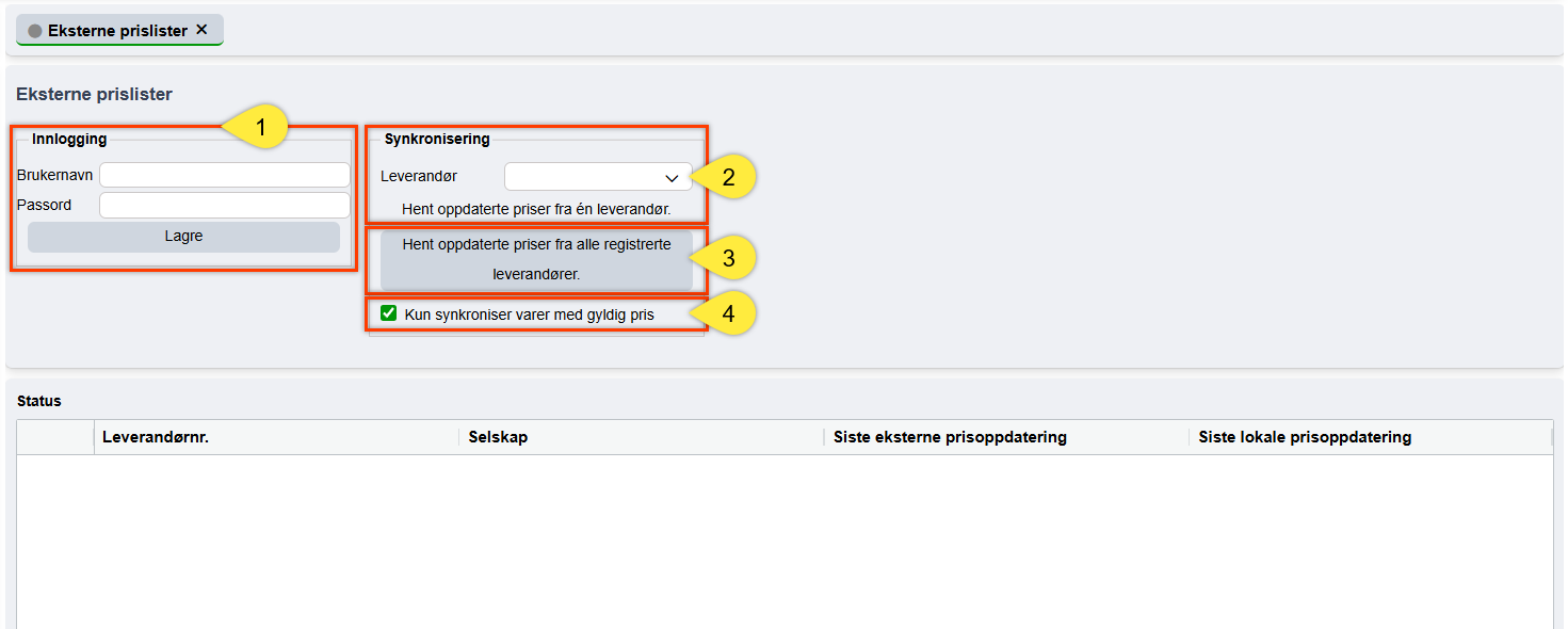 Starter synkronisering mot alle tilgjengelige leverandører på tvers av alle oppsatte varer og varegrupper (mer om leverandøroppsett senere i artikkelen). - Kun synkroniser varer med gyldig pris