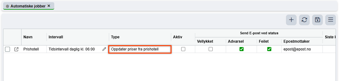 Åpne hovedmenyen (⌨️Alt+H), og finn Innstillinger > Automatiske jobber. Trykk på Plusstegnet for å legge til en ny automatisk jobb, og denne må bruke typen "Oppdater priser fra prishotell" (se eksempel under). Denne kan f.eks. kjøres daglig før åpningstid slik at bedriften alltid har oppdaterte priser ved åpning.