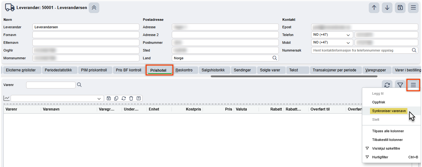 Man kan også velge å synkronisere varenavn fra leverandører man abonnerer på i prishotellet. I motsetning til priser vil dette aldri skje automatisk siden bedriften skal kunne velge om de vil bruke sine egne varenavn/vareinfo på varer i sortimentet. Funksjonen for synkronisering av varenavn ligger derfor inne på hver enkelt leverandørkort under fanen Prishotel for å sikre at det er en bevisst handling å synkronisere varenavn, slik at ingen utilsiktede endringer kan forekomme.