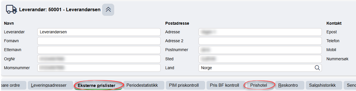 Inne på hvert enkelt leverandørkort vil du nå finne to nye faner: Eksterne Prislister og Prishotel.