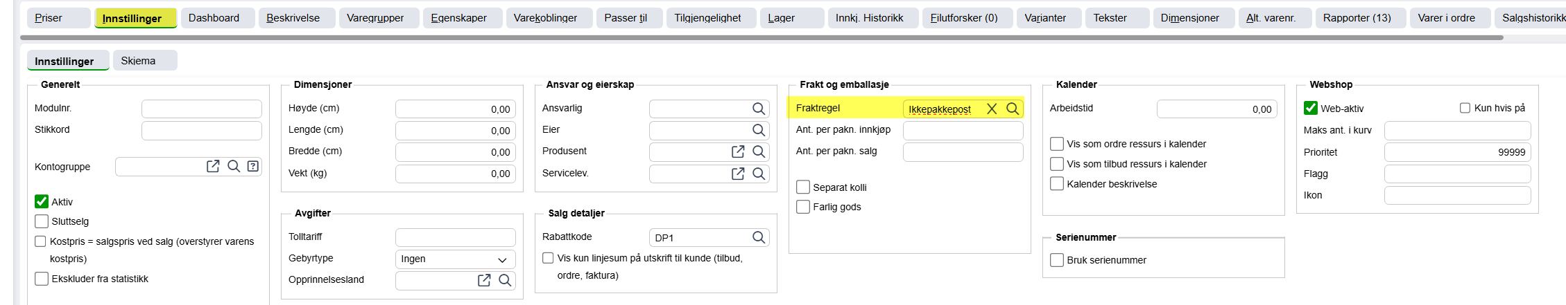 Fraktregler settes opp under fanen Fraktregler som du finner i hovedmenyen under kategorien innstillinger, eller hurtigtast Alt+H søk "Fraktregler".