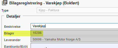 Felt for Bilagnr dukker opp ferdig utfylt idet et bilag bokføres. Bilagnr tildeles ut fra bilagnr serien for bilagstypen. Åpne-ikon for å få direkte til dagboksbunt.