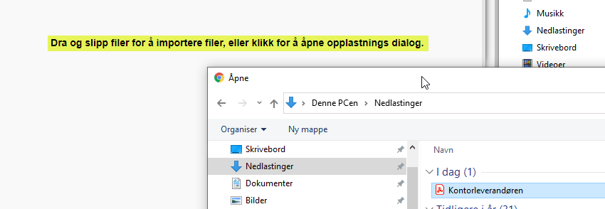 Flere dokumenter kan enkelt legges til ved å trekke de inn fra en ekstern mappe og slippe de i visningsområdet. Hvis det ikke finnes dokumenter tilknyttet fra før av kan man klikke i området for å få opp filarkivet.