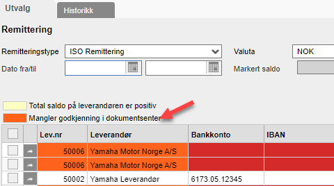 Bilag dukker opp under Remittering når de er bekreftet bokført. Forutsatt at leverandøren har avkryssing for Remittere under Betingelser. Hvis bilaget mangler godkjenning vises remitteringsposten med oransje farge. Den vil da ikke kunne remitteres før forhold rundt godkjenning er klart. En evt avvist godkjenning må slettes, og ny godkjenning må sendes til annen bruker.
