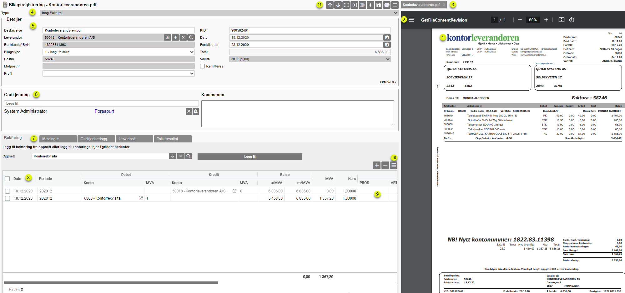 Til høyre i skjermbildet vises dokumentet. Disse kommer automatisk inn ved skanning av bilag, mottak av epost med vedlegg eller EHF. Hvis det er flere dokumenter knyttet til samme bilag kan man enkelt bla mellom dokumentene som ligger der, og endre visningsmodus fra meny (2). Dokumenter vises i samme rekkefølge som de er lagt til.