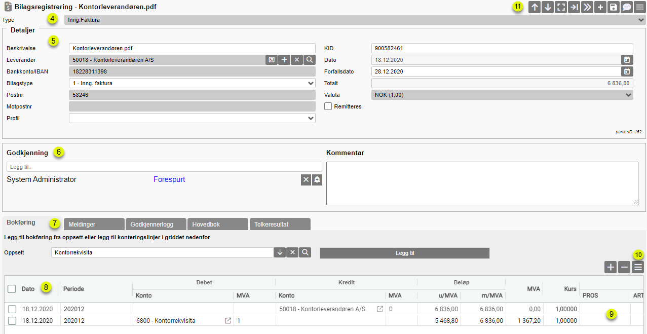 Hvis det er lagt inn oppsett for Konteringsoppsettvelger og Profilvelger på leverandør vil bilaget være ferdig postert når det er importert. Det gjenstår da kun å kontrollere posteringene og Bokføre dokumentet. Se egen artikkel for detaljer om oppsett: Konteringsoppsettvelger / Profilvelger