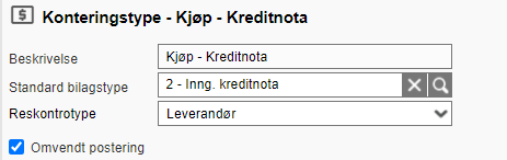 Opprett derfor en egen konteringstype for Kjøp - Kreditnota, som krysses av for Omvendt postering. Det samme gjelder for Innbetaling fra kunde, som også skal ha denne avkryssingen. - Fakturakontroll: Det må opprettes egen konteringstype for Fakturakontroll. Dette åpner for muligheten til å avstemme fakturalinjer mot varemottakslinjer i forkant av endelig bokføring. Denne konteringstypen velges automatisk når det på leverandøren er krysset av for Fakturakontroll fra dokumentsenter.