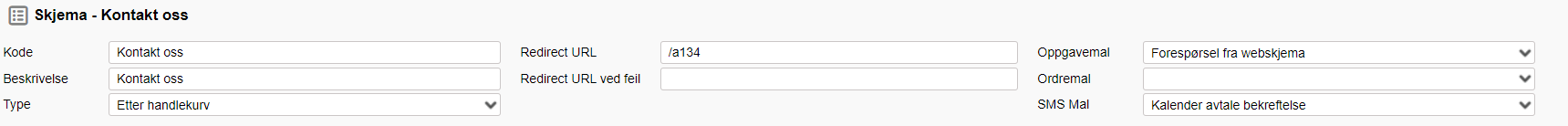 Redirect URL: Her kan du definere hvilken artikkel som skal vises som kvittering når noen har sendt inn skjemaet. (Ofte lager man en egen kvitteringsside under "Artikler" og knytter denne til her.)