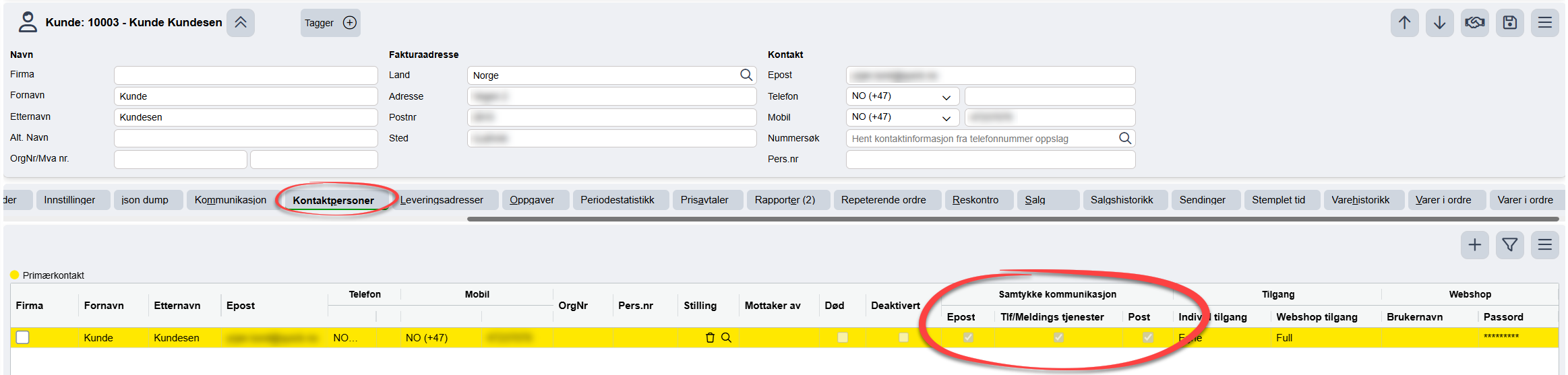 Inne på hvert enkelt kundekort kan du se hva slags samtykker kunden har huket av for, og eventuelt endre disse. Åpne hovedmenyen (⌨️Alt+H), finn menyalternativet Kundesøk. Søk opp kunden du ønsker å se samtykkeinformasjon for, og åpne kundekortet deres. Du finner samtykker spesifikt under fanen "Kontaktpersoner".