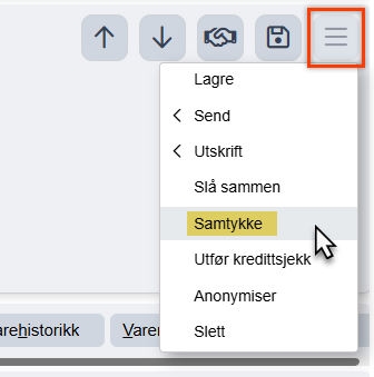 For å endre disse samtykkene, trykk på hamburgermenyen oppe til høyre i toppseksjonen av kundekortet, og velg "Samtykke".
