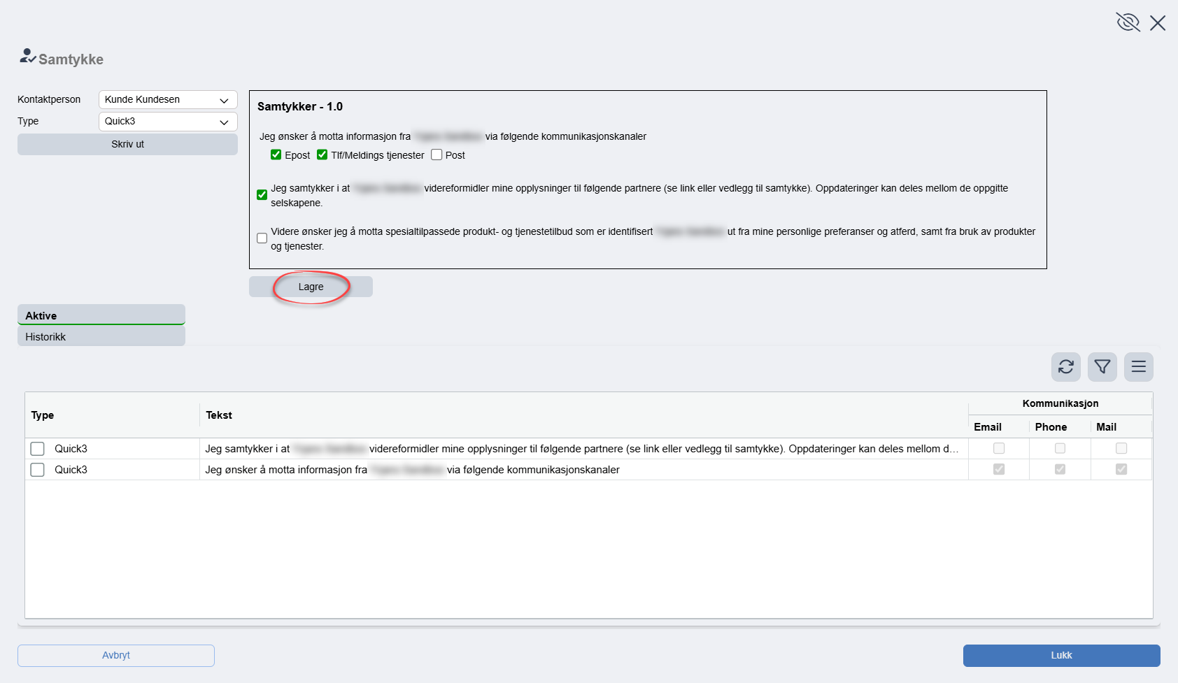 Knappen for å lagre blir aktiv når det blir gjort endringer i samtykkene. Trykk lagre for å oppdatere kundens preferanser, og deretter Lukk for å komme tilbake til kundekortet.
