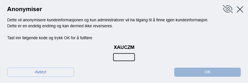 Fra hamburgermenyen på kundekortet kan du velge å anonymisere kunden. Dette vil fjerne navn, adresser, osv., som kan knytte kunden til en identitet. Vi vil ikke slette selve kundeobjektet i databasen siden dette er knyttet til ordre og fakturaer i systemet, men det vil ikke lenger være mulig å identifisere kunden.