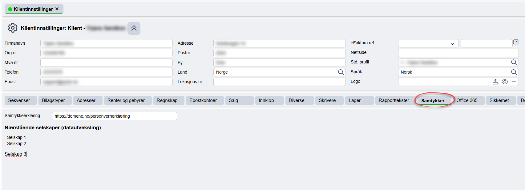 I klientens Klientinnstillinger, under fanen "Samtykke", kan du lenke til firmaets personvernerklæring dersom dere har en. Her kan du også legge til eller fjerne selskaper dere har datautveksling med. Denne listen må være oppdatert, og man bør ha en dataavtale med alle selskapene som står i denne listen.