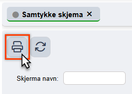 Opplysningene som er ført inn her i klientinnstillingene lenkes automatisk til Samtykkeskjemaet. Dette finner du under Kunde > Rapporter > Samtykkeskjema. Du kan forhåndsvise skjemaet og eventuelt skrive det ut ved å trykke på utskriftsknappen.