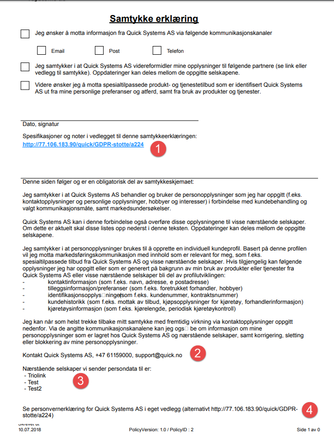 | Dersom klienten deres benytter Webshop løsningen i Quick3 vil kunden selv kunne logge inn på "Min Side" og endre samtykker der. |