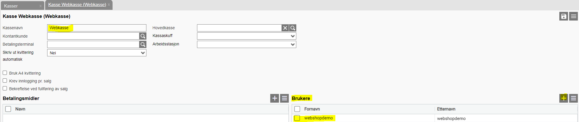Klikk på + for å opprette en ny kasse. Gi kassen navnet Webkasse og knytt til brukeren/ressursen som er satt opp som webshop-bruker, samt de ressursene som skal ta kasseoppgjøret for web.