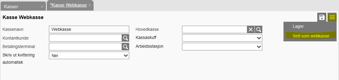 Kassen må nå settes som webkasse. Dette gjør du ved å klikke på hamburgermenyen øverst i høyre hjørne og velger "Sett som webkasse".