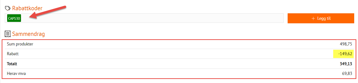 Dersom vi legger denne varen i handlekurven, går til utsjekk og legger inn rabattkoden "CAPS30" i feltet for rabattkoder, vil vi se at rabattkoden er grønn (som betyr at den er valid) og varen blir rabattert med 30%.